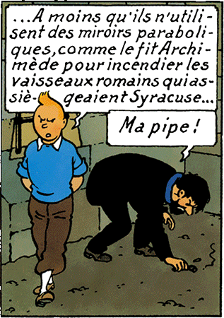 Tintin : ...À moins qu'ils n'utilisent des miroirs paraboliques, comme le fit Archimède pour incendier les vaisseaux romains qui assiègeaient Syracuse...